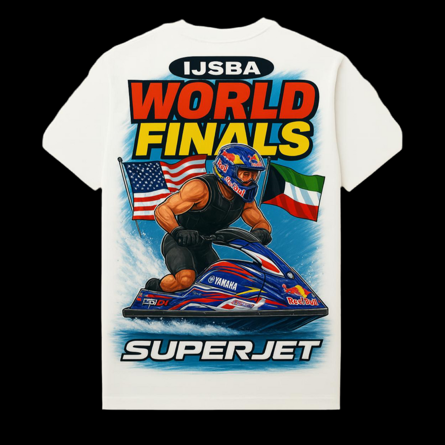 Gear up like a champion. The Finals Ready: Superjet Spec tee is built for those who live for speed, spray, and the roar of the World Finals. Featuring a bold back print inspired by the IJSBA World Finals, this limited-edition DriftDynasty drop pays tribute to Superjet domination and international jet ski culture.